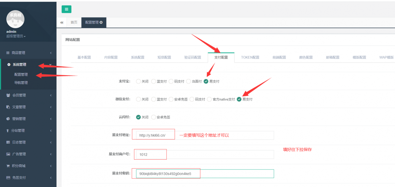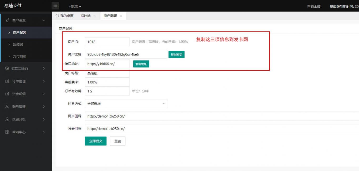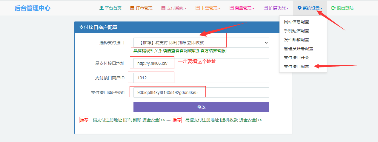 1.首先注册好了的 商户ID和密钥 ,给客服后台登记一下。然后在发卡网选择易支付通道。2.下面是发卡网的对应设置位置根据自己的发卡网来选择。第一款第二款第四款切记 切记 切记,地址一定要写http://y.hkl66.cn/否则不能回调。